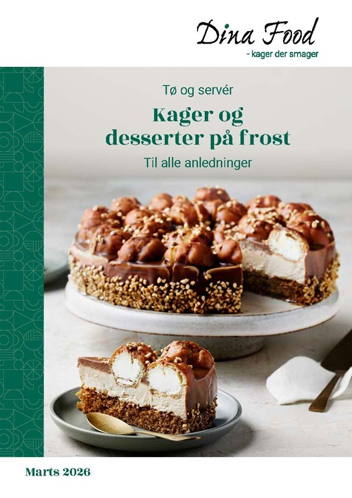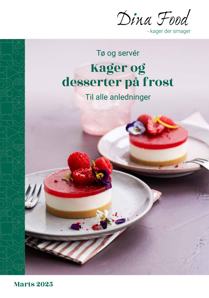 Velkommen til en verden af kager og desserter. Hos Dina Food finder du lækkerier til enhver lejlighed. Vi har specialiseret os i kager og desserter på frost. Vores sortiment består hovedsageligt af produkter, der blot skal tø op og derefter er de klar til servering. På den måde gør vi det nemt og enkelt for dig at forkæle dine gæster med søde sager. Vi arbejder tæt sammen med udvalgte producenter i Europa, som har de bedste kvalitetskager og som tager ansvar for bæredygtighed, miljø, samfund og mennesker i deres virksomhed. Vi har mere end 150 kage- og dessertprodukter, så vi kan hjælpe dig med lige præcis den løsning, som passer til dig og dit professionelle køkken.