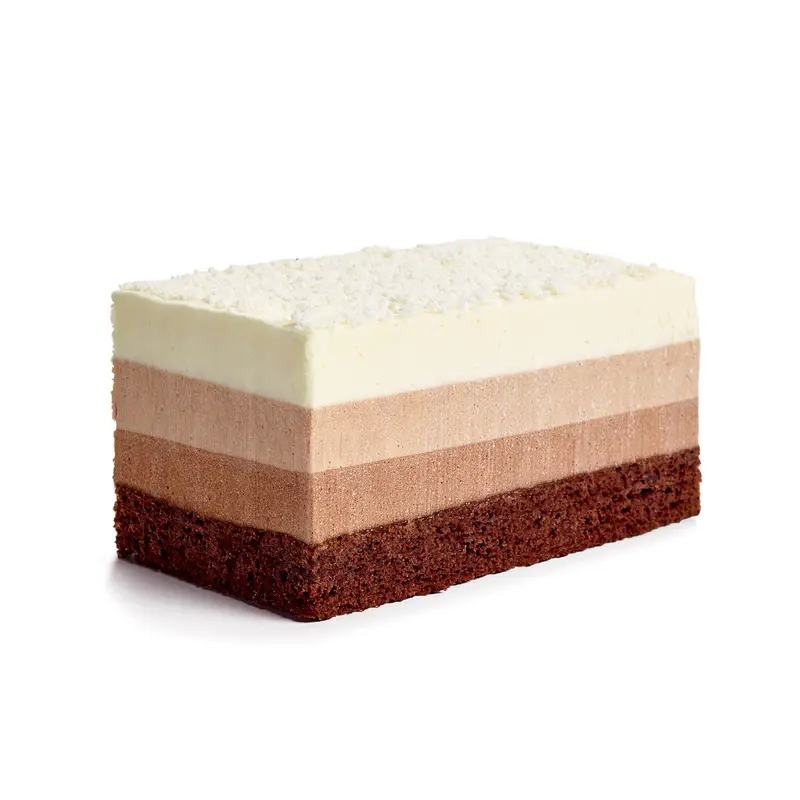 Udsøgt kvalitetskage og ren nydelse. Mælkechokolademousse, mørk chokoladecreme og hvid chokolademousse på en kakaokiksebund. Nem at skære ud i lige det antal desserter der skal bruges og kan anrettes i forvejen. Sæt dit eget præg på dessertanretningen og skab en fryd for øjet og ganen. Kun fantasien sætter grænser.